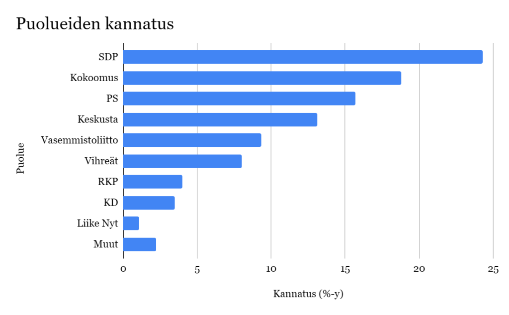 Kiinnostavaa kyllä, puolueiden suosio sosiaalisessa mediassa eroaa merkittävästi kannatusprosenteista. Eniten seuraajia verrattuna kannatusprosenttiin on Liike Nyt:llä, Vasemmistoliitolla ja Vihreillä. Suurimmat somen alisuorittajat ovat puolestaan SDP, Keskusta ja Kokoomus.